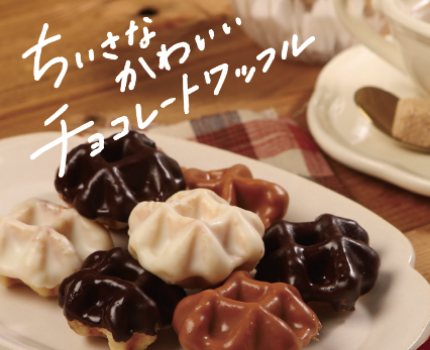 ひとくちサイズのかわいいワッフルにチョコ、ホワイト、キャラメルをコーティング。